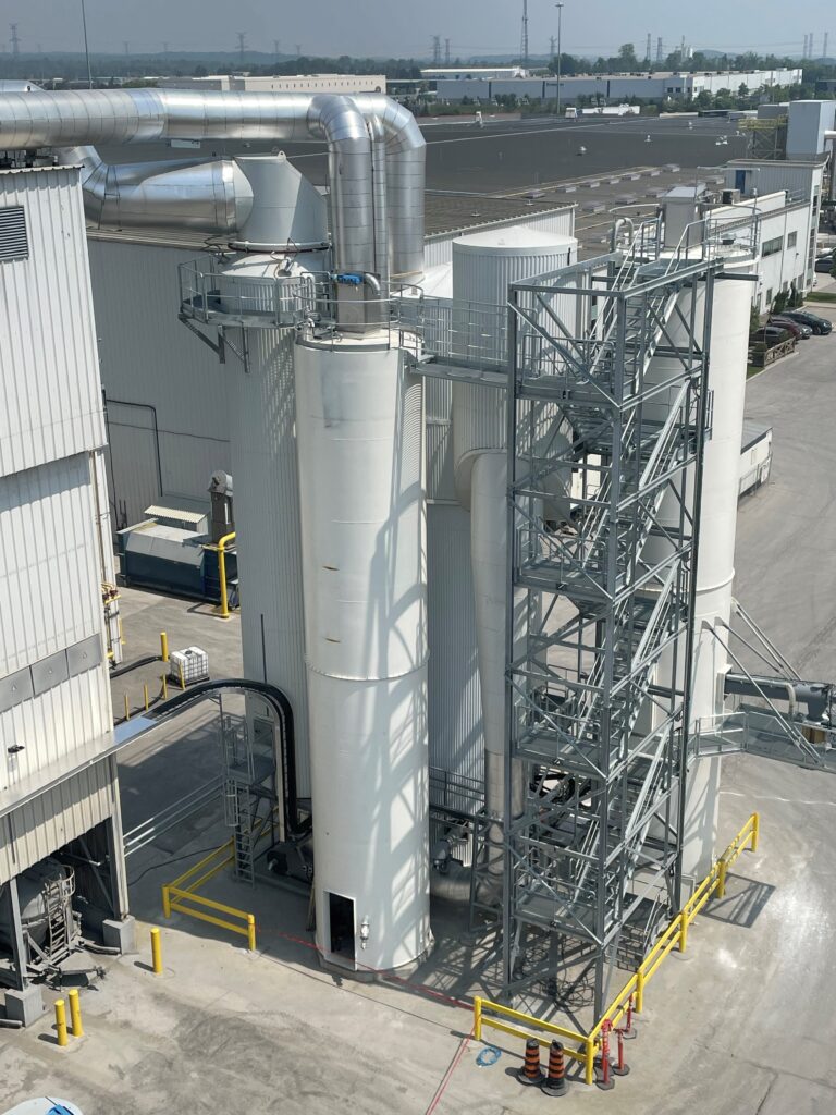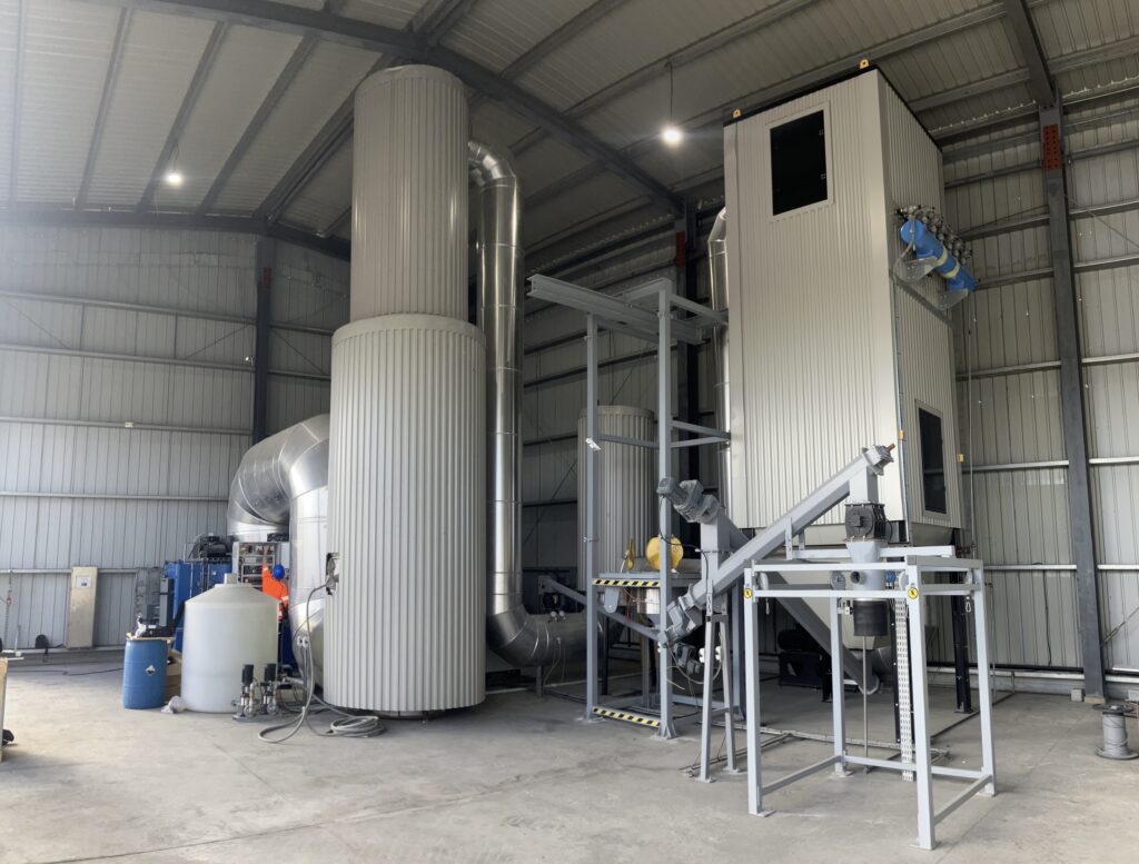 Komplet røggasrensningsanlæg med køletårn, siloer og filter der anvender kalk eller bikarbonat til rensning af svovl.